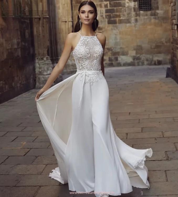 Einführung » Brautmode 2026 » Boho Braut Overall Jumpsuit Einteiler Janett mit Spitze und Schärpe