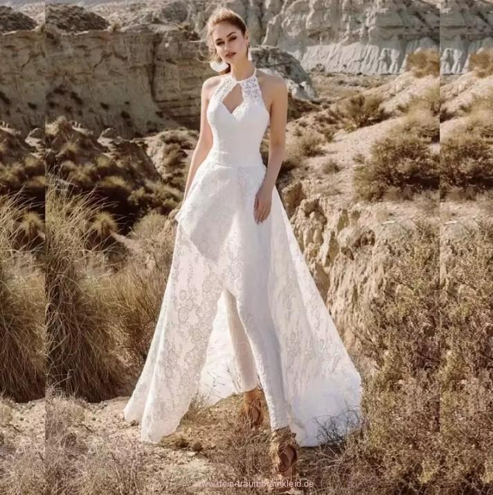 Fashion Hochzeits Overall Jumpsuit Einteiler Jade für die Braut mit Spitzen Schleppe