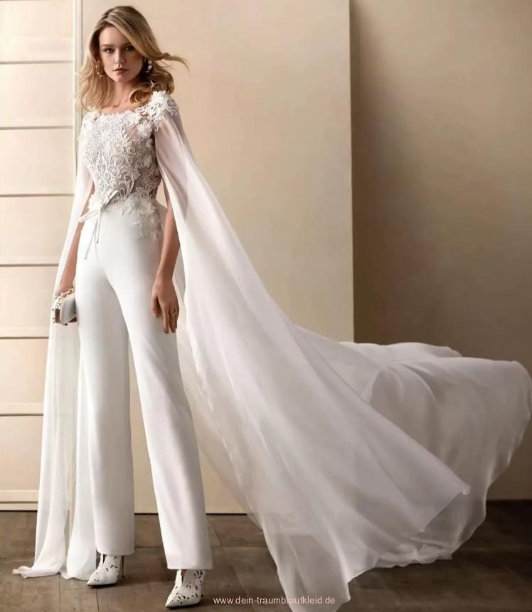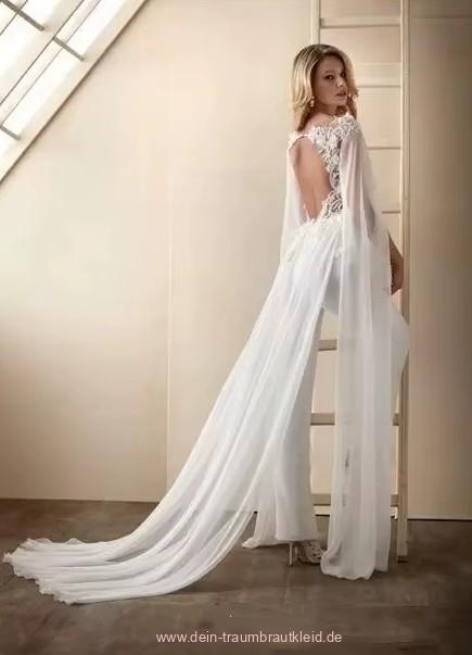 Einführung » Brautmode 2025 - 2026 » I-Linie Braut Einteiler Joana mit Blumen - Spitze und Chiffon Cape