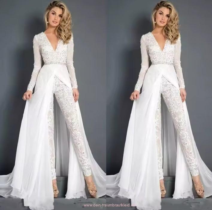 Einführung » Brautmode 2026 » Langarm Braut Overall Jumpsuit Einteiler aus Spitze mit Chiffon Rock