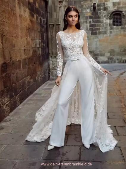 Einführung » Brautmode 2026 » Langarm Hochzeitsoverall Kennya mit Abnehmbarer Schleppe