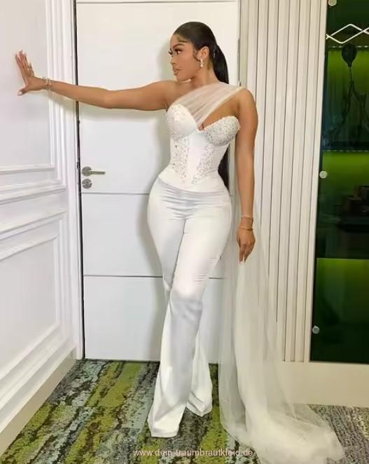 One Shoulder Braut Overall Einteiler Kini mit Perlen Strass Applikationen