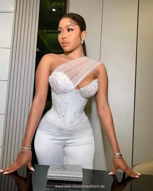 Einführung » Brautmode 2026 » One Shoulder Braut Overall Einteiler Kini mit Perlen Strass Applikationen