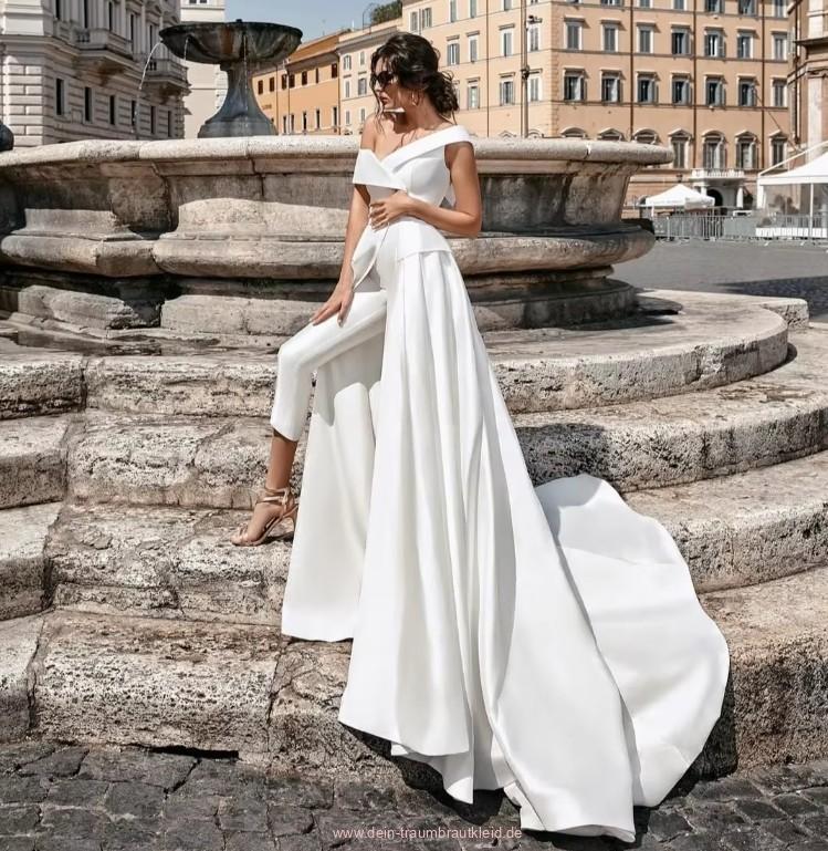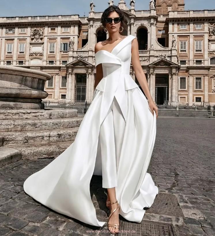 Einführung » Brautmode 2025 - 2026 » One Shoulder Braut Overall Jumpsuit Joaline Schleppe Abnehmbar