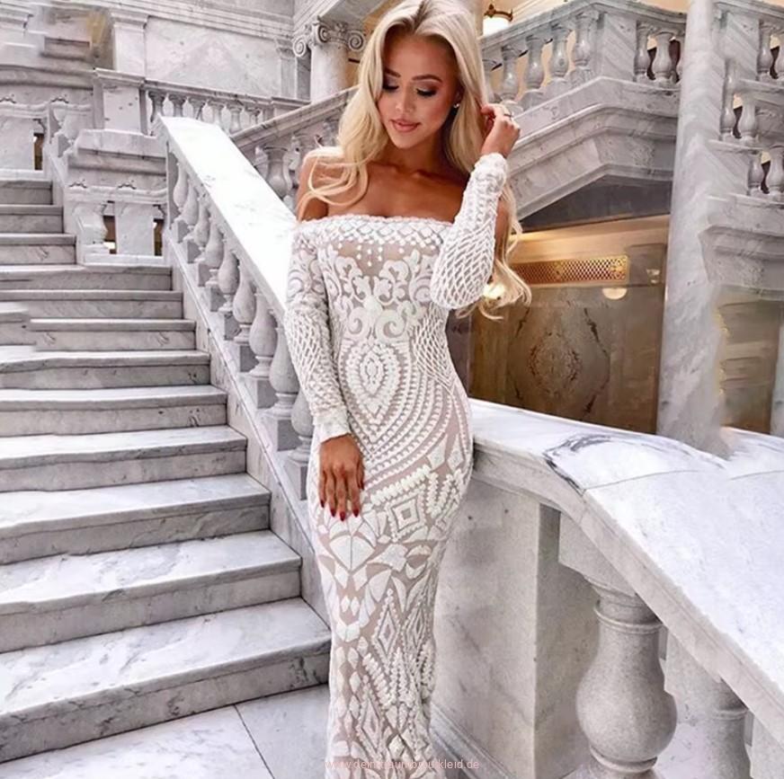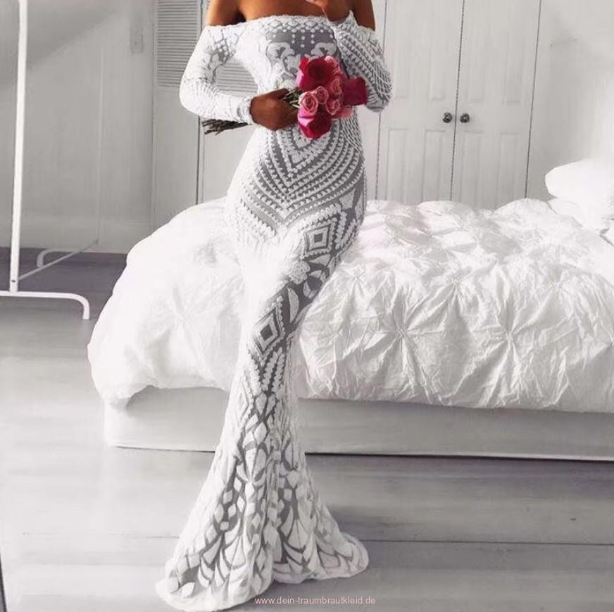 Schulterfreies Langarm Fit and Flare Standesamt Brautkleid Annika Bodenlang
