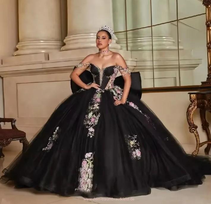 Schulterfreies Prinzessin Brautkleid Janka in Schwarz mit Blumen Stickereien