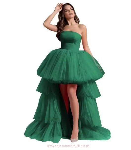 Einführung » Brautmode 2025 - 2026 » Schulterfreies Vokuhila Tüll Brautkleid Josina in Dunkel Grün Vorne Kurz Hinten Lang