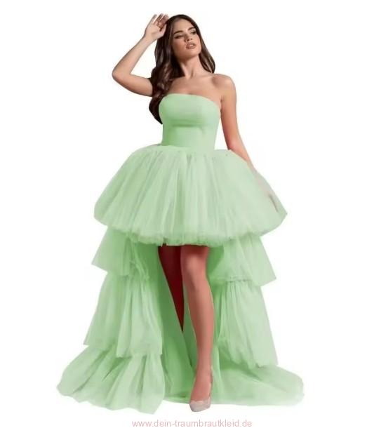Einführung » Brautmode 2025 - 2026 » Schulterfreies Vokuhila Tüll Brautkleid Josina in Hell Grün Vorne Kurz Hinten Lang