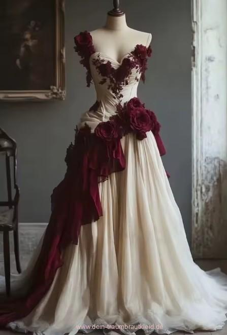 Einführung » Brautmode 2025 - 2026 » Vintage Stil Brautkleid Juliena Ivory Weinrot mit 3D Blumen